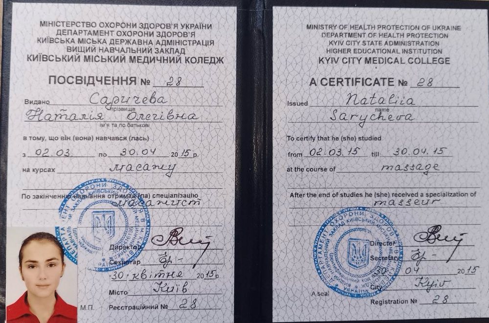 Маю медичну освіту та працювала 6 років медсестрою, допомагаючи діткам та їх батькам комфортно проходити різні обстеження. Як масажист працюю 3 роки, постійно вдосконалюючи свої техніки та знання.